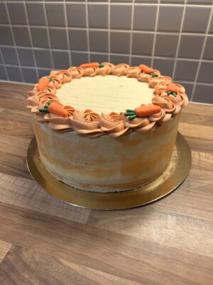 Leipomon suosittu porkkanakakku kätkee sisälleen perinteisen tuorejuustotäytteen. Kakun kruunaa kuorrutteena oleva suolakinuskikreemi.